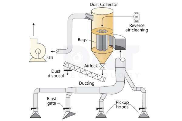 Giống như các hệ thống hút bụi khác, hệ thống hút bụi gỗ sẽ có một quạt ly tâm với công suất cực lớn, hệ thống thùng chứa bụi, ống dẫn, chụp hút, … Các thiết bị đó phối hợp với nhau để thực hiện tách bụi khỏi dòng không khí.