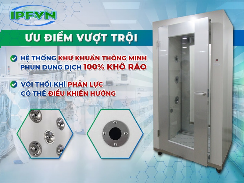 Máy giúp khử khuẩn toàn bộ bụi bẩn, vi khuẩn trên bề mặt cơ thể, quần áo hay vật dụng của người sử dụng nhờ vào hệ thống lọc HEPA và tia UV.