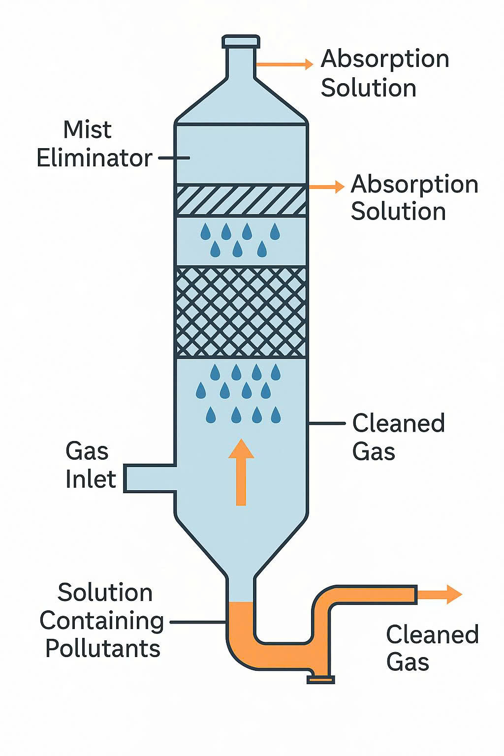 ⏺️Khí thải được đưa vào tháp, đi ngược chiều với dung dịch hấp thụ (thường là nước hoặc dung dịch kiềm/axit).