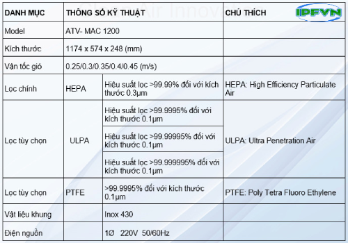 Bảng thông số kĩ thuật quạt lọc khí khung Inox ATV - MAC 1200