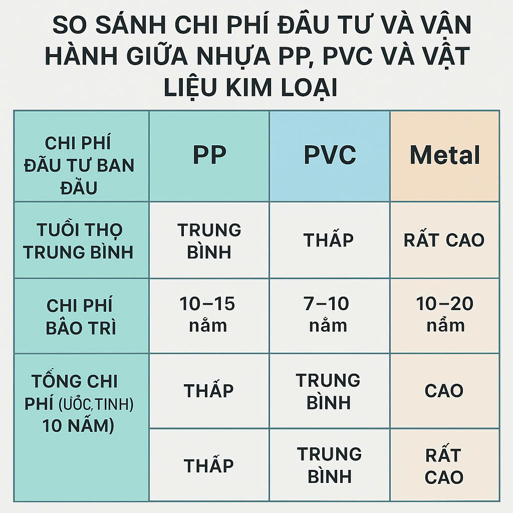 Nhận xét: Nhựa PVC rẻ nhất nhưng chỉ nên dùng trong hệ thống nhỏ. Nhựa PP là giải pháp cân bằng giữa chi phí – độ bền. Kim loại đắt nhất và yêu cầu kỹ thuật cao.