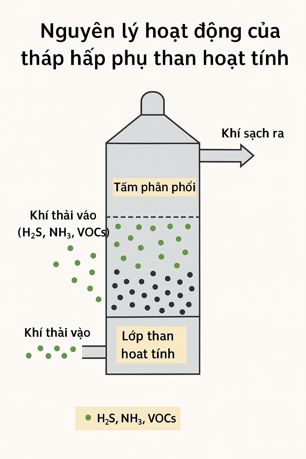 Tháp hấp phụ than hoạt tính là thiết bị dùng để loại bỏ các hợp chất hữu cơ dễ bay hơi (VOCs), khí độc, khí mùi như NH₃, H₂S, SO₂ trong khí thải công nghiệp. Thiết bị hoạt động dựa trên cơ chế hấp phụ vật lý, trong đó khí ô nhiễm được giữ lại trên bề mặt lỗ xốp của hạt than hoạt tính khi dòng khí đi qua.