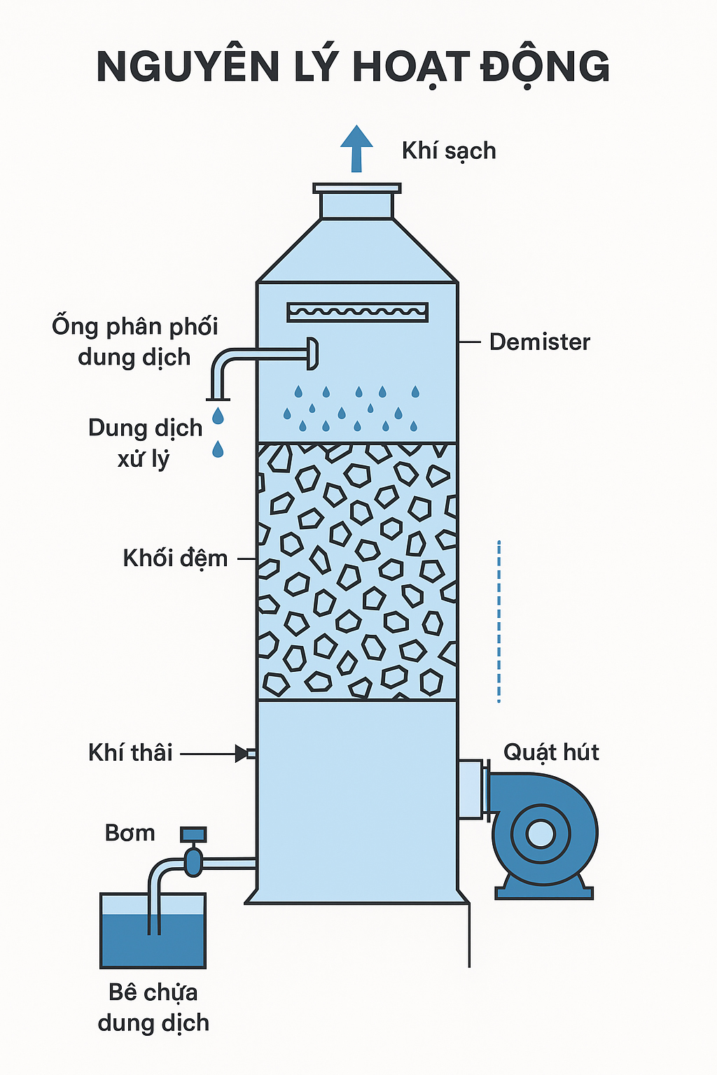 - Dung dịch xử lý được phun từ trên đỉnh tháp, đi xuống ngược chiều dòng khí.